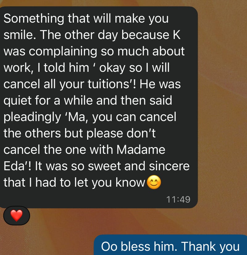 Eda's teaching for my daughter is brilliant, she is becoming so much more confident with French, even her teachers are now telling how advanced she is. Eda's teaching is so important and we appreciate it. A.U
